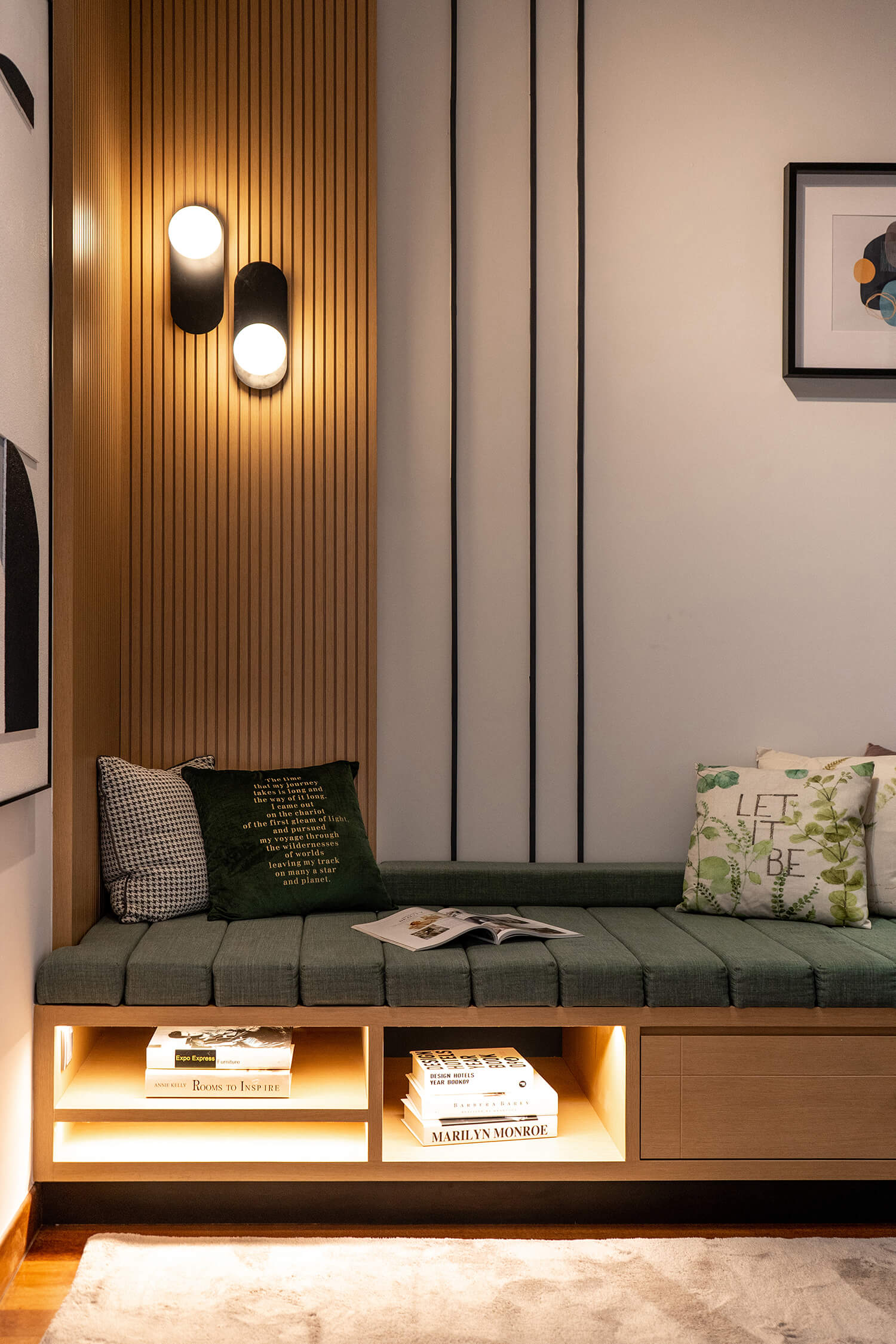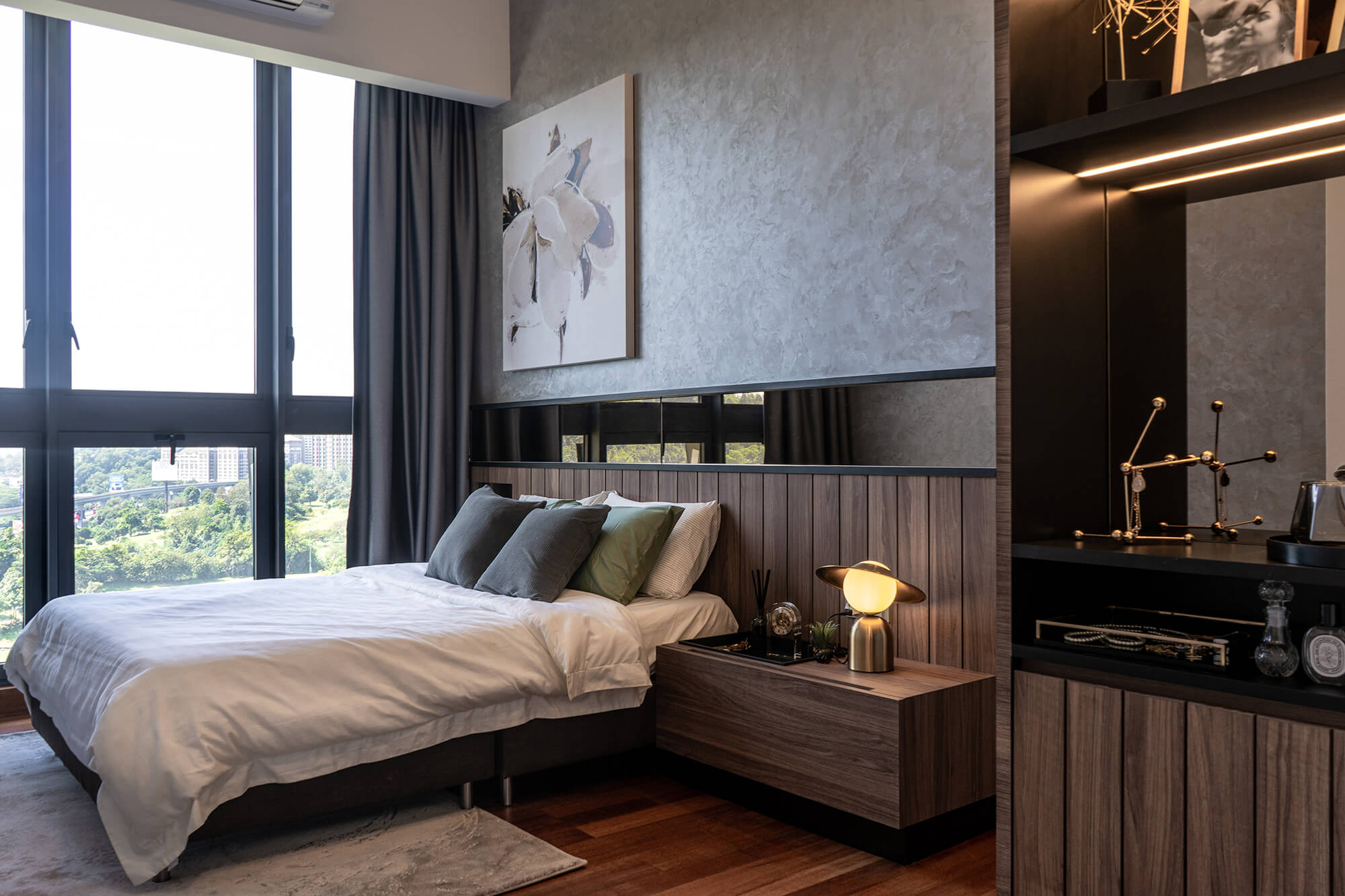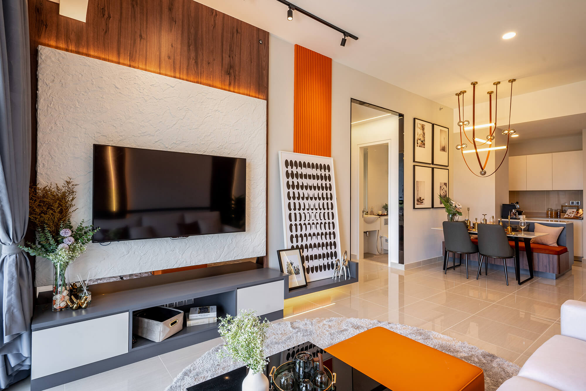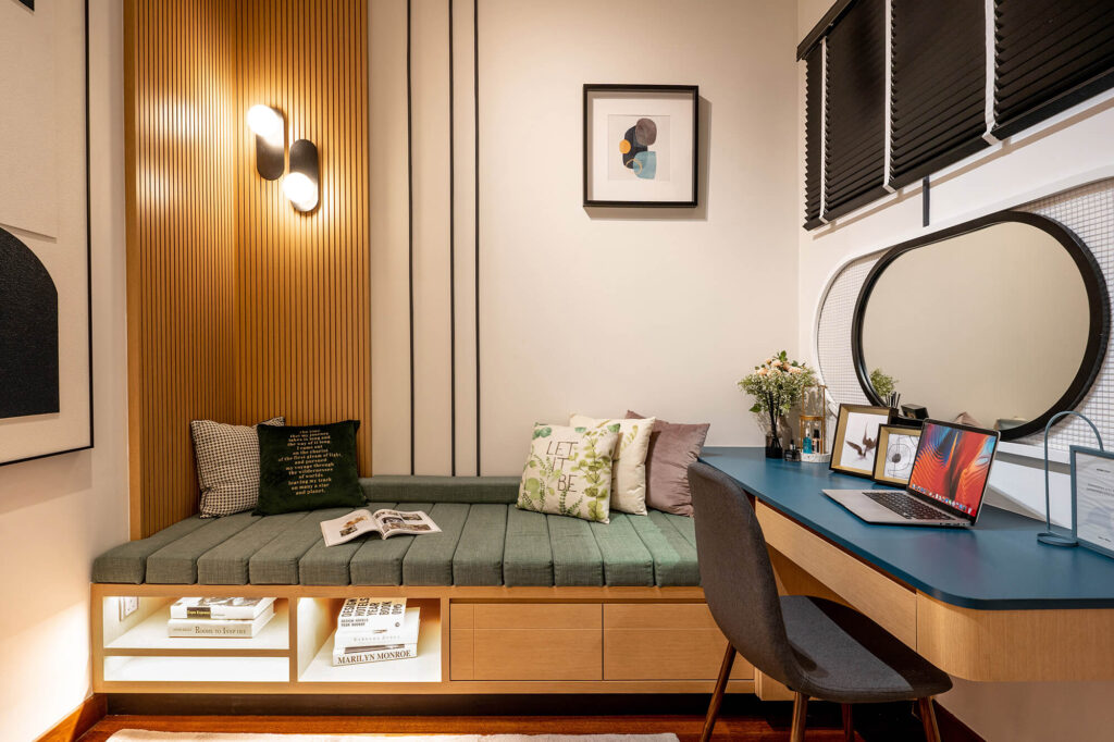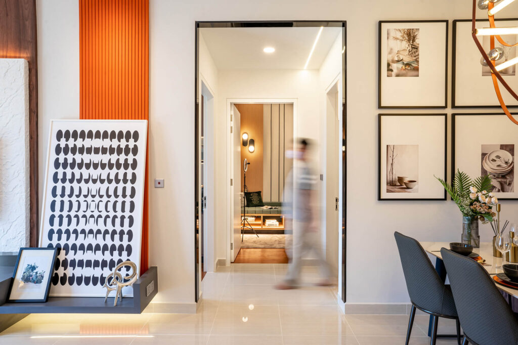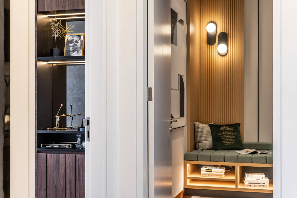 Tailored for a contemporary, professional couple, the design for the Senada Residence Show Unit centres on the principle of “Millennial Modernism.” The spatial narrative reinterprets modernism through the lenses of scale and hierarchy, utilizing varying proportions to maximize the sense of volume within a compact footprint.